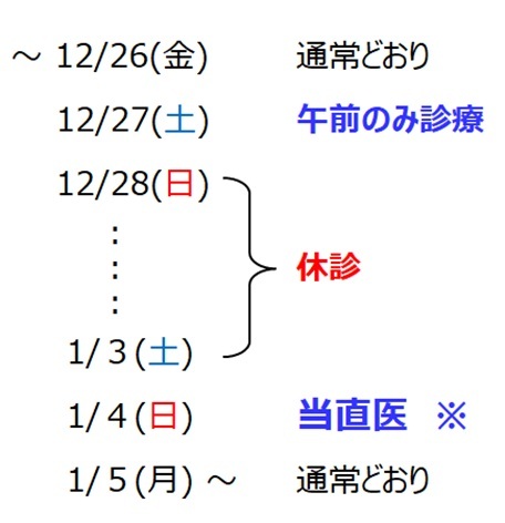 年末年始期間中に当院の診療につきましては、以下のとおりです。