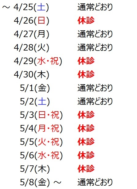 ゴールデンウィークにおける当院の診療につきましては、以下のとおりとさせていただきます。